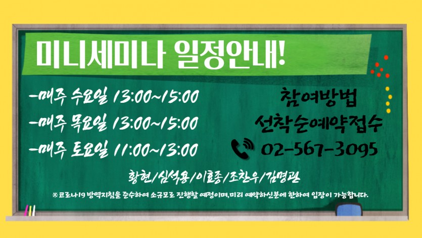 미니세미나 일정안내 페이지 정보 작성자 … 댓글 0건 조회Hit 3,337회 작성일Date 21-03-30 14:55 본문 예약은 필수입니다. 02 - 567 - 3095 목록 답변 이전글세미나 안내 24.11.25 댓글목록 댓글목록 등록된 댓글이 없습니다.